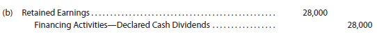 The preceding entry accounts for the dividends portion of the change to Retained Earnings. It also identifies the cash flow in the bottom portion of the spreadsheet as related to financing activities. The $28,000 of declared dividends will be adjusted later for the actual amount of cash dividends paid during the year.