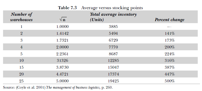 The following data from an actual company demonstrate how average inventory level increases as the number of stocking locations increase. Though the number is given as average inventory, this level is directly related with safety inventory (see Table 7.3).