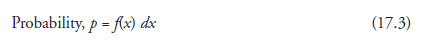 We have seen that in the graphical form of this relation (Figure 17.5), the area under the curve between any two values of x is a measure of probability. Considering the interval on abscissa from x to (x + dx), we may now write the expression for probability corresponding to width dx as