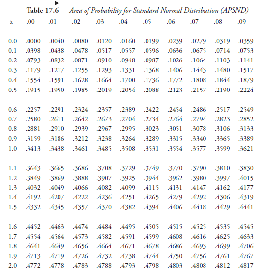 Suppose there is a need to integrate just one equation, and the results are applicable to any normal distribution whatsoever. That, precisely, is the equation that represents the standard normal distribution. The integration is already done by the mathematicians; the area under the curve is evaluated for all possible limits to the required degree of accuracy and provided in the form of a compact table, referred to as “Areas of Probability for Standard Normal Distribution” (APSND). It is made available in many standard texts on statistics, as well as in books on other subjects having to deal with probability. It is reproduced here as Table 17.5.