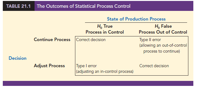 The null hypothesis H0 is formulated in terms of the production process being in control. The alternative hypothesis Ha is formulated in terms of the production process being out of control. Table 21.1 shows that correct decisions to continue an in-control process and adjust an out-of-control process are possible. However, as with other hypothesis testing procedures, both a Type I error (adjusting an in-control process) and a Type II error (allowing an out-of-control process to continue) are also possible.