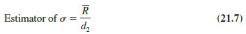 The American Society for Testing and Materials Manual on Presentation of Data and Control Chart Analysis provides values for d2 as shown in Table 21.3. For instance, when n = 5, d2 = 2.326, and the estimate of s is the average range divided by 2.326. If we substitute R/d2 for s in expression (21.6), we can write the control limits for the x chart as