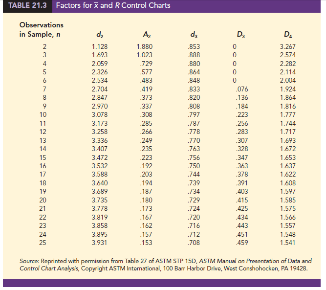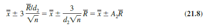 Note that A2 = 3/(d2Vn) is a constant that depends only on the sample size. Values for A2 are provided in Table 21.3. For n = 5, A2 = .577; thus, the control limits for the x chart are