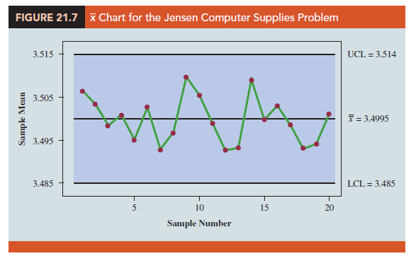 Figure 21.7 shows the X chart for the Jensen Computer Supplies problem. The center line is shown at the overall sample mean X = 3.4995. The upper control limit (UCL) is 3.514 and the lower control (LCL) is 3.485. The X chart shows the 20 sample means plotted over time. Because all 20 sample means are within the control limits, we confirm that the process mean was in control during the sampling period.