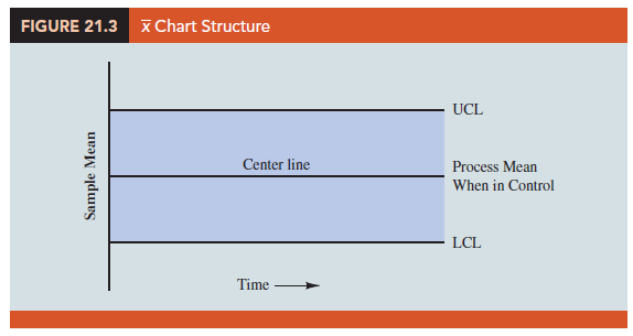Figure 21.3 shows the general structure of an X chart. The center line of the chart corresponds to the mean of the process when the process is in control. The vertical line identifies the scale of measurement for the variable of interest. Each time a sample is taken from the production process, a value of the sample mean X is computed and a data point showing the value of X is plotted on the control chart.