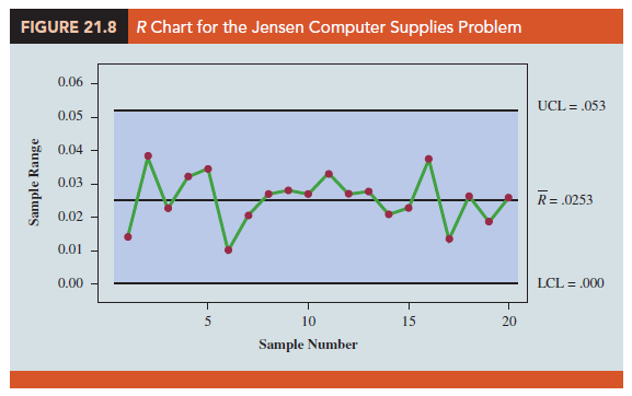 Figure 21.8 shows the R chart for the Jensen Computer Supplies problem. The center line is shown at the overall mean of the 20 sample ranges, R = .0253. The UCL is .053 and the LCL is .000. The R chart shows the 20 sample ranges plotted over time. Because all 20 sample ranges are within the control limits, we confirm that the process variability was in control during the sampling period.