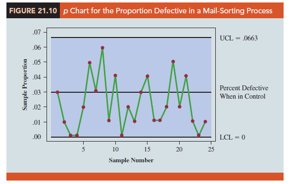 Figure 21.10 is the p chart for the mail-sorting process. The points plotted show the sample proportion defective found in samples of letters taken from the process. All points are within the control limits, providing no evidence to conclude that the sorting process is out of control.