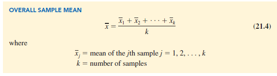 For the JCS data in Table 21.2, the overall sample mean is X = 3.4995. This value will be the center line for the X chart. The range of each sample, denoted R, is simply the difference between the largest and smallest values in each sample. The average range for k samples is computed as follows: