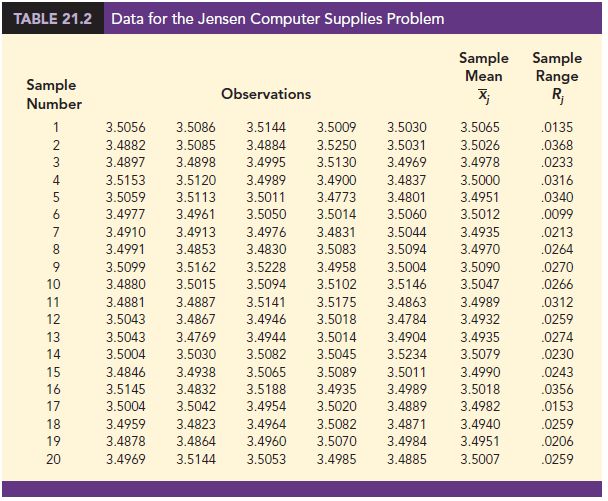 Jensen Computer Supplies (JCS) manufactures 3.5-inch-diameter solid-state drives; they just finished adjusting their production process so that it is operating in control. Suppose random samples of five drives were selected during the first hour of operation, five drives were selected during the second hour of operation, and so on, until 20 samples were obtained. Table 21.2 provides the diameter of each drive sampled as well as the mean Xj and range R for each of the samples.