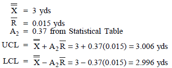 ILLUSTRATION 1: Several samples of size n = 8 have been taken from today’s production of fence posts. The average post was 3 yards in length and the average sample range was 0.015 yard. Find the 99.73% upper and lower control limits.