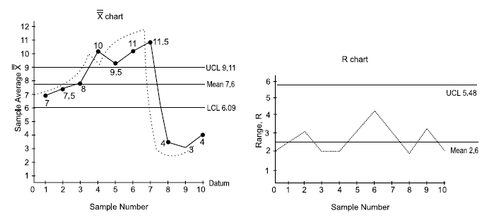 As the name indicates, these charts will use variable data of a process. X chart given an idea of the central tendency of the observations. These charts will reveal the variations between sample observations. R chart gives an idea about the spread (dispersion) of the observations. This chart shows the variations within the samples.