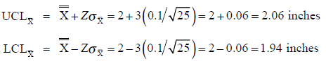 ILLUSTRATION 3: Twenty-five engine mounts are sampled each day and found to have an average width of 2 inches, with a standard deviation of 0.1 inche. What are the control limits that include 99.73% of the sample means (z = 3)?