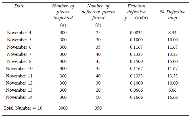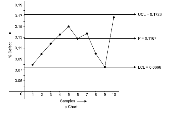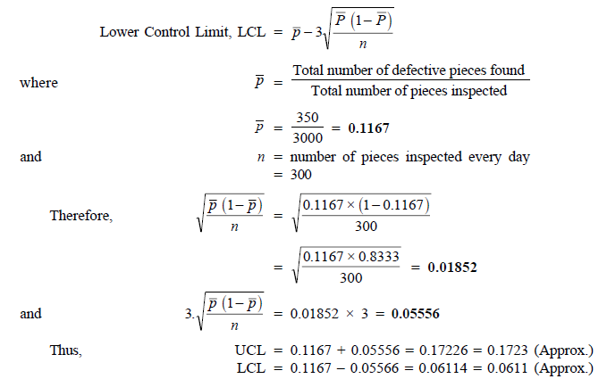 ILLUSTRATION 4 (Problem on p-Chart): The following are the inspection results of 10 lots, each lot being 300 items. Number defectives in each lot is 25, 30, 35, 40, 45, 35, 40, 30, 20 and 50. Calculate the average fraction defective and three sigma limit for P-chart and state whether the process is in control.