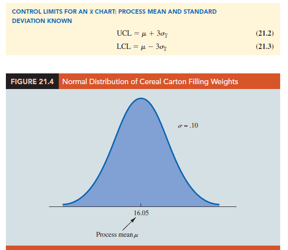 To illustrate the construction of an X chart, let us reconsider the situation at KJW Packaging. Recall that KJW operates a production line where cartons of cereal are filled. When the process is operating correctly—and hence the system is in control—the mean filling weight is m = 16.05 ounces, and the process standard deviation is σ = .10 ounces. In addition, the filling weights are assumed to be normally distributed. This distribution is shown in Figure 21.4.