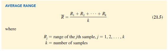 For the JCS data in Table 21.2, the overall sample mean is X = 3.4995. This value will be the center line for the X chart. The range of each sample, denoted R, is simply the difference between the largest and smallest values in each sample. The average range for k samples is computed as follows:
