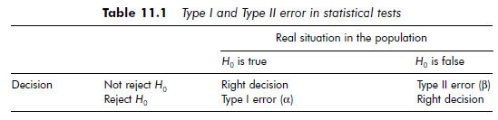 Statistical tests are used to give an indication as to what decision to make – for instance, whether to reject or not to reject the null hypothesis H0. As this decision is, in most research situations, based on partial information only, derived from observations made of a sample of the population, a margin of error is involved (Sincich, 1996; Zikmund, 1994). A distinction is made between two types of error in statistical tests: error of the first type, or Type I error (a), and error of the second type, or Type II error (P).