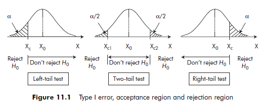 The set of values of the statistic X that lead to rejecting the null hypothesis is called the rejection region (or the critical region). The complementary region is called the acceptance region (or, more accurately, the non-rejection region). The value representing the limit of the rejection region is called the critical value. In a one-tail test, there is only one critical value Xc, while in a two-tail test, there are two; Xc1 and Xc2. The acceptance region and the rejection region are both dependant on Type I error a, since a is the probability of rejecting H0 when it is actually true, and 1-a is the probability of not rejecting H0 when it is true. This relationship is illustrated by Figure 11.1.