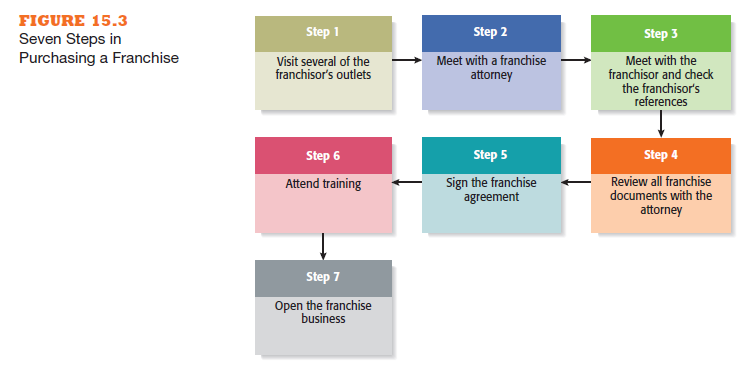 Purchasing a franchise system is a seven-step process, as illustrated in Figure 15.3. The first rule of buying a franchise is to avoid making a hasty de- cision. Again, owning a franchise is typically costly and labor-intensive, and the purchase of a franchise should be a careful, deliberate decision. Once the decision to purchase a franchise has been nearly made, however, the following steps should be taken. If at any time prior to signing the franchise agreement the prospective franchisee has second thoughts, the process should be stopped until the prospective franchisee’s concerns are adequately addressed.