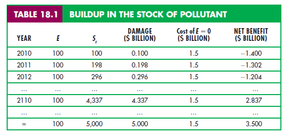 NUMERICAL EXAMPLE We can make this concept more concrete with a simple example. Suppose that, absent government intervention, 100 units of a pollutant will be emitted into the atmosphere every year for the next 100 years; the rate at which the stock dissipates, S, is 2 percent per year, and the stock of pollutant is initially zero. Table 18.1 shows how the stock builds up over time. Note that after 100 years, the stock will reach a level of 4,337 units. (If this level of emissions continued forever, the stock will eventually approach E/S = 100/.02 = 5,000 units.)