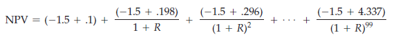 To determine whether a policy of zero emissions makes sense, we must calculate the NPV of the policy, which in this case is the present discounted value of the annual net benefits shown in Table 18.1. Denoting the discount rate by R, the NPV is: