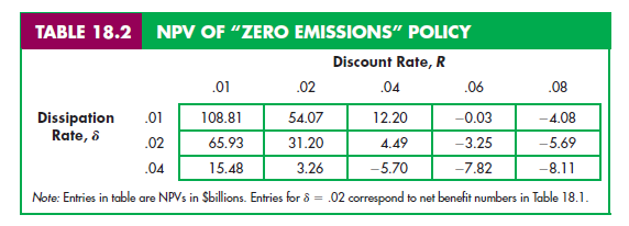 Is this NPV positive or negative? The answer depends on the discount rate, R. Table 18.2 shows the NPV as a function of the discount rate. (The middle row of Table 18.2, in which the dissipation rate 8 is 2 percent, corresponds to Table 18.1. Table 18.2 also shows NPVs for dissipation rates of 1 percent and 4 percent.) For discount rates of 4 percent or less, the NPV is clearly positive, but if the discount rate is large, the NPV will be negative.