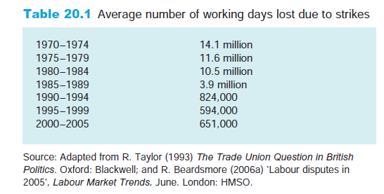 Because the decline started in 1979 at the time that Margaret Thatcher was first elected prime minister, the actions of her governments have frequently been cited as a major source of the trade unions’ decline. While it is true that a series of hostile employment Acts passed on to the statute books in the 1980s did not help the union cause, the extent to which these directly impacted on union decline was limited. The only full-frontal legal attack on the ability of unions to recruit members came in the form of regulations which made it impossible to sustain closed shop agreements whereby membership of a specific trade union was a necessary pre-condition of employment in certain workplaces. This was a major reform, affecting over five million employees who worked in closed shops (Dunn and Gennard 1984), but it did not lead directly to a great number of resignations from unions. Membership decline may have been partly precipitated by legislation of the 1980s and early 1990s which sought to reduce the number of strikes by making it harder for a union to press its demands through industrial action, but there is little evidence to support this. The view that ‘anti-union’ legislation can be blamed for membership decline in the UK is thus unconvincing, especially as the substantial downward trend in the number of trade unionists was and still is an international trend (see Vissa 2002).