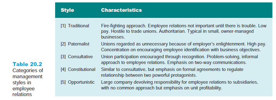 One of the best-known typologies of management style is that developed by Purcell and Sisson (1983) following extensive research into the different approaches favoured by employers. These are summarised in Table 20.2. Their categories are useful, although some organisations do not fit easily into any one of them. Most large, long-established companies will be in one of the last three; most public sector organisations will be in category 4; and many newer businesses will be in some version of category 2. Smaller organisations tend to take the ‘traditional’ approach, having no considered employee relations strategy in place.