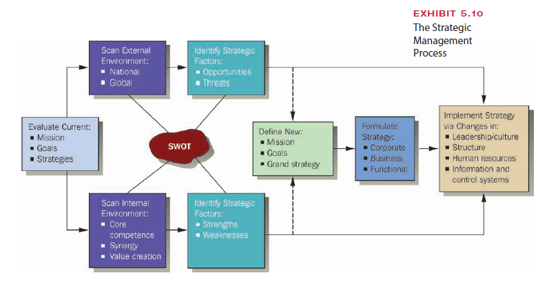The overall strategic management process is illustrated in Exhibit 5.10. It begins when executives evaluate their current position with respect to mission, goals, and strategies. Then they scan the organization’s internal and external environments and identify strategic factors that might require change. Internal or external events might indicate a need to redefine the mission or goals or to formulate a new strategy at the corporate, business, or functional level. The final stage in the strategic management process is to implement the new strategy.