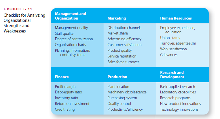 Internal Strengths and Weaknesses. Strengths are positive internal characteristics that the organization can exploit to achieve its strategic performance goals. Weaknesses are internal characteristics that might inhibit or restrict the organization’s per- formance. Some examples of what executives evaluate to interpret strengths and weak- nesses are given in Exhibit 5.11.The information sought typically pertains to specific func- tions such as marketing, finance, production, and R&D. Internal analysis also examines overall organization structure, management competence and quality, and human resource characteristics. Based on their understanding of these areas, managers can determine their strengths or weak- nesses compared to other companies.