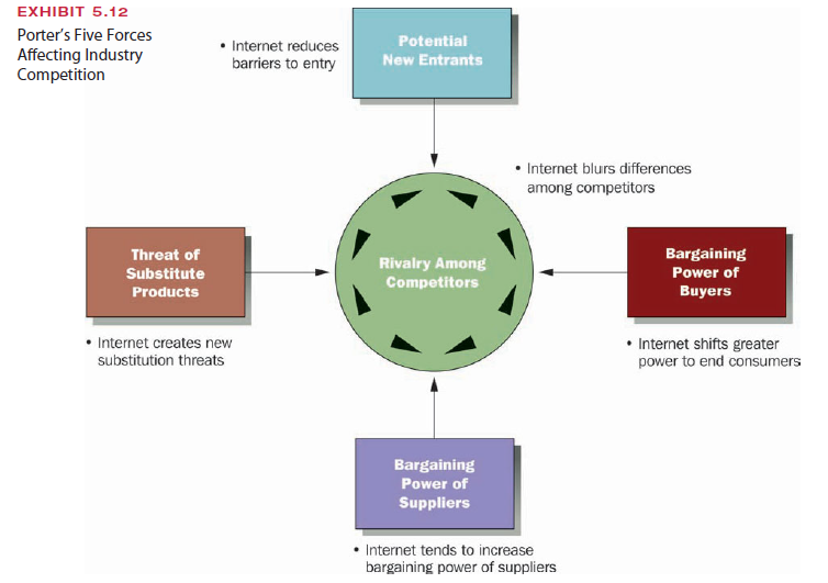 Exhibit 5.12 illustrates the competitive forces in a company’s environment and indicates some ways that Internet technology is affecting each area. These forces help to determine a company’s position vis-à-vis competitors in the industry environment.