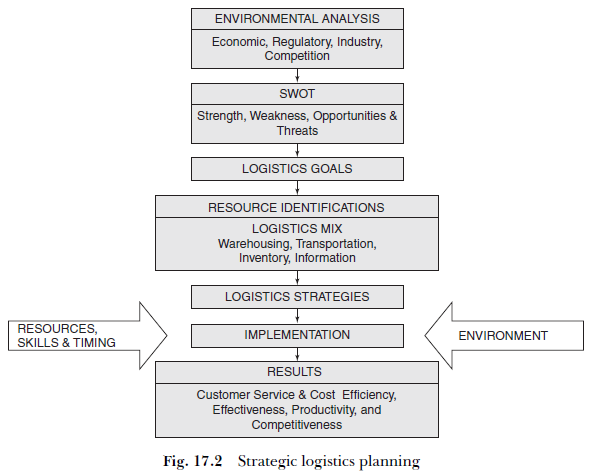 The strategic logistics planning process starts with analysis of the external and internal environment, which will decide its limitations, resource requirements and barriers to extend superior service to the customers. The regulatory framework in the country or internal resource constraints may not allow the firm to avail of certain opportunities, or may create barriers to extend the desired level of service to customers. The environmental analysis will help in identifying the company’s strengths, weaknesses, opportunities and the threats in serving the customer. This, in turn, will help in formulating the supporting strategies and organizing the appropriate resources (logistics mix) to achieve the logistics goals.
