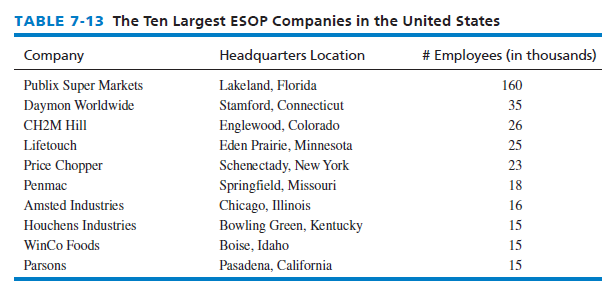 Besides reducing worker alienation and stimulating productivity, employee stock ownership plans (ESOPs) allow firms other benefits, such as substantial tax savings. An ESOP is a tax- qualified, defined-contribution, employee-benefit plan whereby employees purchase stock of the company through borrowed money or cash contributions. These plans empower employees to work as owners; this is a primary reason why the number of ESOPs have grown dramatically to more than 10,000 firms covering more than 14 million employees. Today, ESOPs control more than $600 billion in corporate stock in the United States. “The ownership culture really makes a difference, when management is a facilitator, not a dictator,” observes Corey Rosen, executive director of the National Center for Employee Ownership. The 10 largest employee-owned companies are listed in Table 7-13.