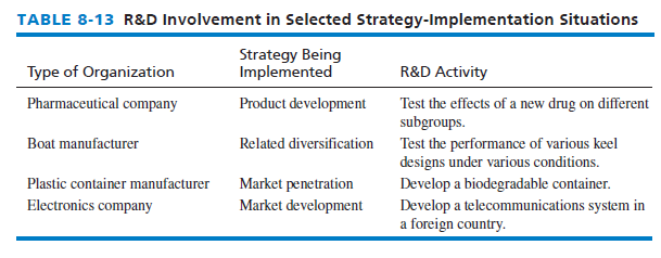 Research and development policy among rival firms often varies dramatically. Various pharmaceutical firms, for example, have a philosophical disagreement over the merits of heavy investment to discover new drugs, versus waiting for others to spend the money and then follow up with similar products. Table 8-13 gives some examples of R&D activities that could be required for successful implementation of various strategies. Many U.S. utility, energy, and automotive companies have charged their R&D departments with determining how the firm can effectively reduce its gas emissions.