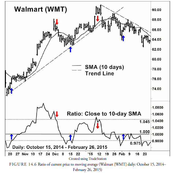 An example of the deviation about a 10-day SMA is shown in Figure 14.6. This is a ratio of the close to its 10-day moving average. It is a stock with a strong upward trend (the dominant trend for our purposes). When prices are trending strongly, they naturally will deviate from the moving average in the direction of the trend more than they will against it. In Figure 14.6, you can see that the advances carry much higher above the equilibrium level of 1.00 than they do during a correction in the upward trend. Action signal lines can thus be established, by testing, at the levels that optimize counter-trend signals. In Figure 14.6, we have arbitrarily used 1.0450 as the ratio below which we would sell WMT even in its upward trend and 0.9750 as the buy level above which we go long. Following this method, we go long on October 21 at 76.02 and sell at 86.40 on December 2. Again, we go long on the upward break of the ratio buy level on December 15 at 83.94 and sell at 89.35 on January 9. We have made nice profits by trading along the trend. The last buy signal comes on February 3 at 86.19. Notice, however, that the trend line has been broken and that the trend may now be going sideways or downward. We sold at the high but hesitate to buy on the signal because of the potential trend change. What else can go wrong? Sometimes the trend is so strong that the ratio never reaches below the buy level. A buy entry stop should thus be placed above the bar where the sale took place. In the last example on the chart, where the trend may have changed, the buy may not work, but if it has a sell stop at its signal bar low, a breaking of that low would indicate a trend change downward and the buy and sell levels in the ratio would be the reciprocals of the upward trend levels. Before you try this system, you should be sure to test for the optimal ratio levels under all trend directions including a flat trend. In this example, we did not optimize the levels; thus, they should not be used until tested.