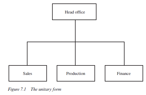 Figure 7.1 illustrates the structure of a U-form enterprise. It is centralised and divided into departments which specialise in certain enterprisewide functions. For illustrative purposes, the functions identified are the conventional production, sales and finance; but we might also have added other possible functions depending upon the character of the enterprise, such as research and development, personnel and distribution. This U- form structure reflects the advantages of arranging both for managers to specialise in the problems of a particular function and for communication to be established mainly along functional lines. Production managers communicate primarily with other production workers and, for the most part, do not require detailed information about finance or marketing. Given the bounds on the individual’s information-processing capacity, each manager is left to concentrate on specific links that are expected to be most important for his or her particular purpose or function.