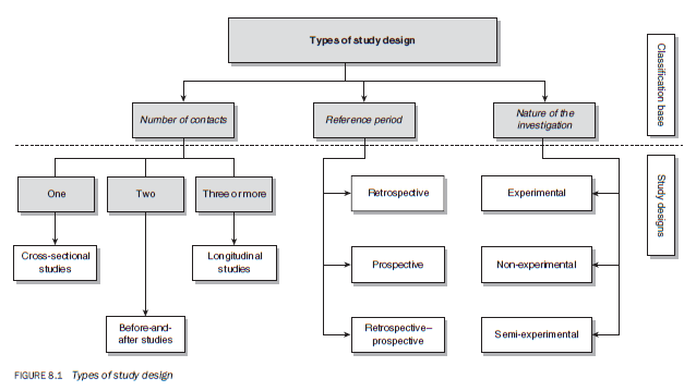 Every study design can be classified from each one of these perspectives. These perspectives are arbitrary bases of classification; hence, the terminology used to describe them is not universal. However, the names of the designs within each classification base are universally used. Note that the designs within each category are mutually exclusive; that is, if a particular study is cross-sectional in nature it cannot be at the same time a before-and-after or a longitudinal study, but it can be a non-experimental or experimental study, as well as a retrospective study or a prospective study. See Figure 8.1.
