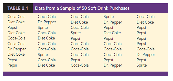 Let us use the following example to demonstrate the construction and interpretation of a frequency distribution for categorical data. Coca-Cola, Diet Coke, Dr. Pepper, Pepsi, and Sprite are five popular soft drinks. Assume that the data in Table 2.1 show the soft drink selected in a sample of 50 soft drink purchases.