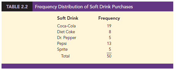 To develop a frequency distribution for these data, we count the number of times each soft drink appears in Table 2.1. Coca-Cola appears 19 times, Diet Coke appears 8 times, Dr. Pepper appears 5 times, Pepsi appears 13 times, and Sprite appears 5 times. These counts are summarized in the frequency distribution in Table 2.2.