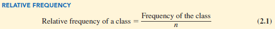 A frequency distribution shows the number (frequency) of observations in each of several nonoverlapping classes. However, we are often interested in the proportion, or percentage, of observations in each class. The relative frequency of a class equals the fraction or proportion of observations belonging to a class. For a data set with n observations, the relative frequency of each class can be determined as follows: