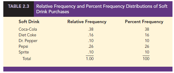 A relative frequency distribution gives a tabular summary of data showing the relative frequency for each class. A percent frequency distribution summarizes the percent frequency of the data for each class. Table 2.3 shows a relative frequency distribution and a percent frequency distribution for the soft drink data. In Table 2.3 we see that the relative frequency for Coca-Cola is 19/50 = .38, the relative frequency for Diet Coke is 8/50 = .16, and so on. From the percent frequency distribution, we see that 38% of the purchases were Coca-Cola, 16% of the purchases were Diet Coke, and so on. We can also note that 38% + 26% + 16% = 80% of the purchases were for the top three soft drinks.