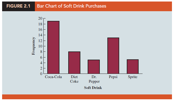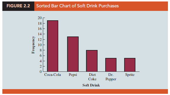 A bar chart is a graphical display for depicting categorical data summarized in a frequency, relative frequency, or percent frequency distribution. On one axis of the chart (usually the horizontal axis), we specify the labels that are used for the classes (categories). A frequency, relative frequency, or percent frequency scale can be used for the other axis of the chart (usually the vertical axis). Then, using a bar of fixed width drawn above each class label, we extend the length of the bar until we reach the frequency, relative frequency, or percent frequency of the class. For categorical data, the bars should be separated to emphasize the fact that each category is separate. Figure 2.1 shows a bar chart of the frequency distribution for the 50 soft drink purchases. Note how the graphical display shows Coca-Cola, Pepsi, and Diet Coke to be the most preferred brands. We can make the brand preferences even more obvious by creating a sorted bar chart as shown in Figure 2.2. Here, we sort the soft drink categories: highest frequency on the left and lowest frequency on the right.
