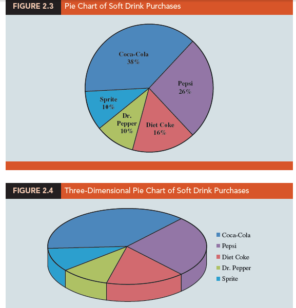 The pie chart provides another graphical display for presenting relative frequency and percent frequency distributions for categorical data. To construct a pie chart, we first draw a circle to represent all the data. Then we use the relative frequencies to subdivide the circle into sectors, or parts, that correspond to the relative frequency for each class. For example, because a circle contains 360 degrees and Coca-Cola shows a relative frequency of .38, the sector of the pie chart labeled Coca-Cola consists of .38(360) = 136.8 degrees. The sector of the pie chart labeled Diet Coke consists of .16(360) = 57.6 degrees. Similar calculations for the other classes yield the pie chart in Figure 2.3. The numerical values shown for each sector can be frequencies, relative frequencies, or percent frequencies. Although pie charts are common ways of visualizing data, many data visualization experts do not recommend their use because people have difficulty perceiving differences in area. In most cases, a bar chart is superior to a pie chart for displaying categorical data.
