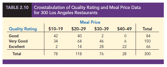 Although four classes of the meal price variable were used to construct the crosstabulation shown in Table 2.10, the crosstabulation of quality rating and meal price could have been developed using fewer or more classes for the meal price variable. The issues involved in deciding how to group the data for a quantitative variable in a crosstabulation are similar to the issues involved in deciding the number of classes to use when constructing a frequency distribution for a quantitative variable. For this application, four classes of meal price were considered a reasonable number of classes to reveal any relationship between quality rating and meal price.