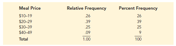 Note that the values in the relative frequency column do not add exactly to 1.00 and the values in the percent frequency distribution do not add exactly to 100; the reason is that the values being summed are rounded. From the percent frequency distribution we see that 26% of the meal prices are in the lowest price class ($10-19), 39% are in the next higher class, and so on.