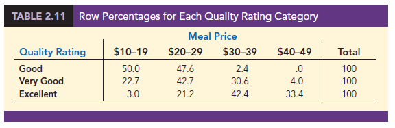 Converting the entries in a crosstabulation into row percentages or column percentages can provide more insight into the relationship between the two variables. For row percentages, the results of dividing each frequency in Table 2.10 by its corresponding row total are shown in Table 2.11. Each row of Table 2.11 is a percent frequency distribution of meal price for one of the quality rating categories. Of the restaurants with the lowest quality rating (good), we see that the greatest percentages are for the less expensive restaurants (50% have $10-19 meal prices and 47.6% have $20-29 meal prices). Of the restaurants with the highest quality rating (excellent), we see that the greatest percentages are for the more expensive restaurants (42.4% have $30-39 meal prices and 33.4% have $40-49 meal prices). Thus, we continue to see that restaurants with higher meal prices received higher quality ratings.