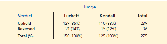 A review of the column percentages shows that 86% of the verdicts were upheld for Judge Luckett, while 88% of the verdicts were upheld for Judge Kendall. From this aggregated crosstabulation, we conclude that Judge Kendall is doing the better job because a greater percentage of Judge Kendall’s verdicts are being upheld.