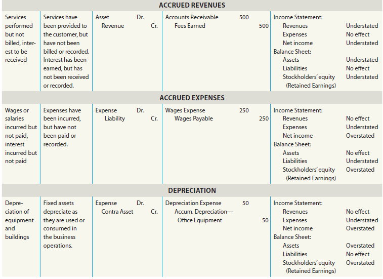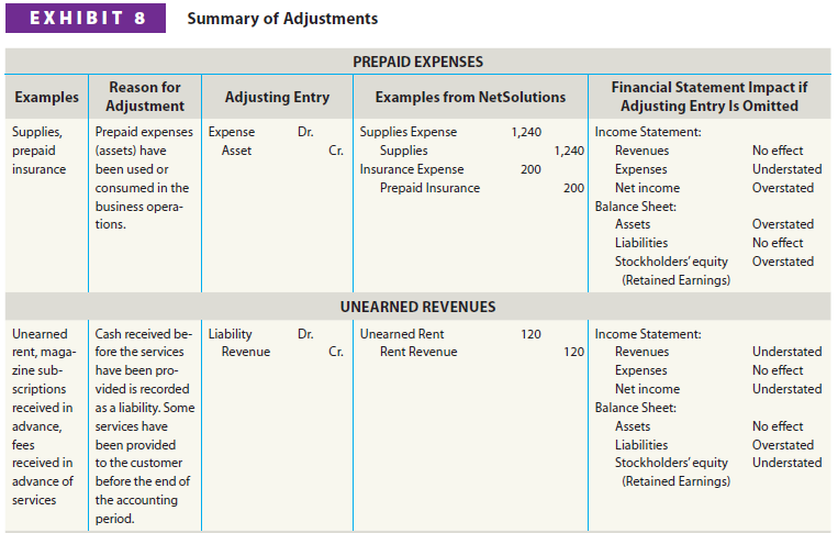 A summary of the basic types of adjusting entries is shown in Exhibit 8 on page 120. The process. adjusting entries for NetSolutions are shown in Exhibit 9 on page 121. The adjusting entries are dated as of the last day of the period. However, because collecting the adjustment data requires time, the entries are usually recorded at a later date. An explanation is normally included with each adjusting entry.