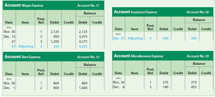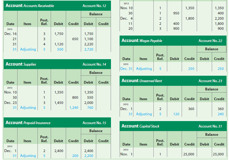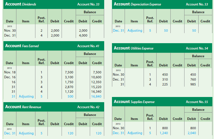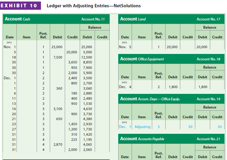 NetSolutions’ adjusting entries are posted to the ledger shown in Exhibit 10 on pages 122-123. The adjustments are shown in color in Exhibit 10 to distinguish them from other transactions.