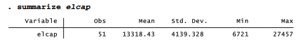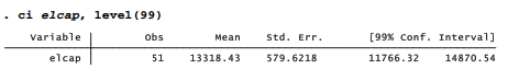 The statistics produced by summarize or tabstat describe the sample at hand. For some purposes, although probably not with U.S. states data, we might want to construct confidence intervals suggesting inferences about a larger population. As an illustration, obtaining a 99% confidence interval for the mean of elcap: