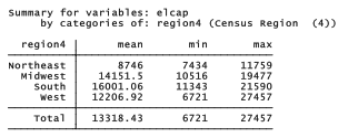 . tabstat elcap, stats(mean min max) by(reglon4)
